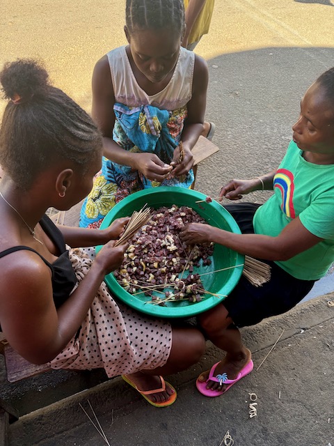 In Nosy Be, the Mada resort town where I spent several days, a brochette stand is a sensation. Customers line up in the evening for take-home brochettes, about 11 US cents each. The tiny stand was started by the mother of some of the workers years ago. It’s grown into a thriving family business, employing daughters, granddaughters and cousins, all at work cutting up 25 kilos of zebu every day, then assembling the brochettes with the meat, green papaya, and more.