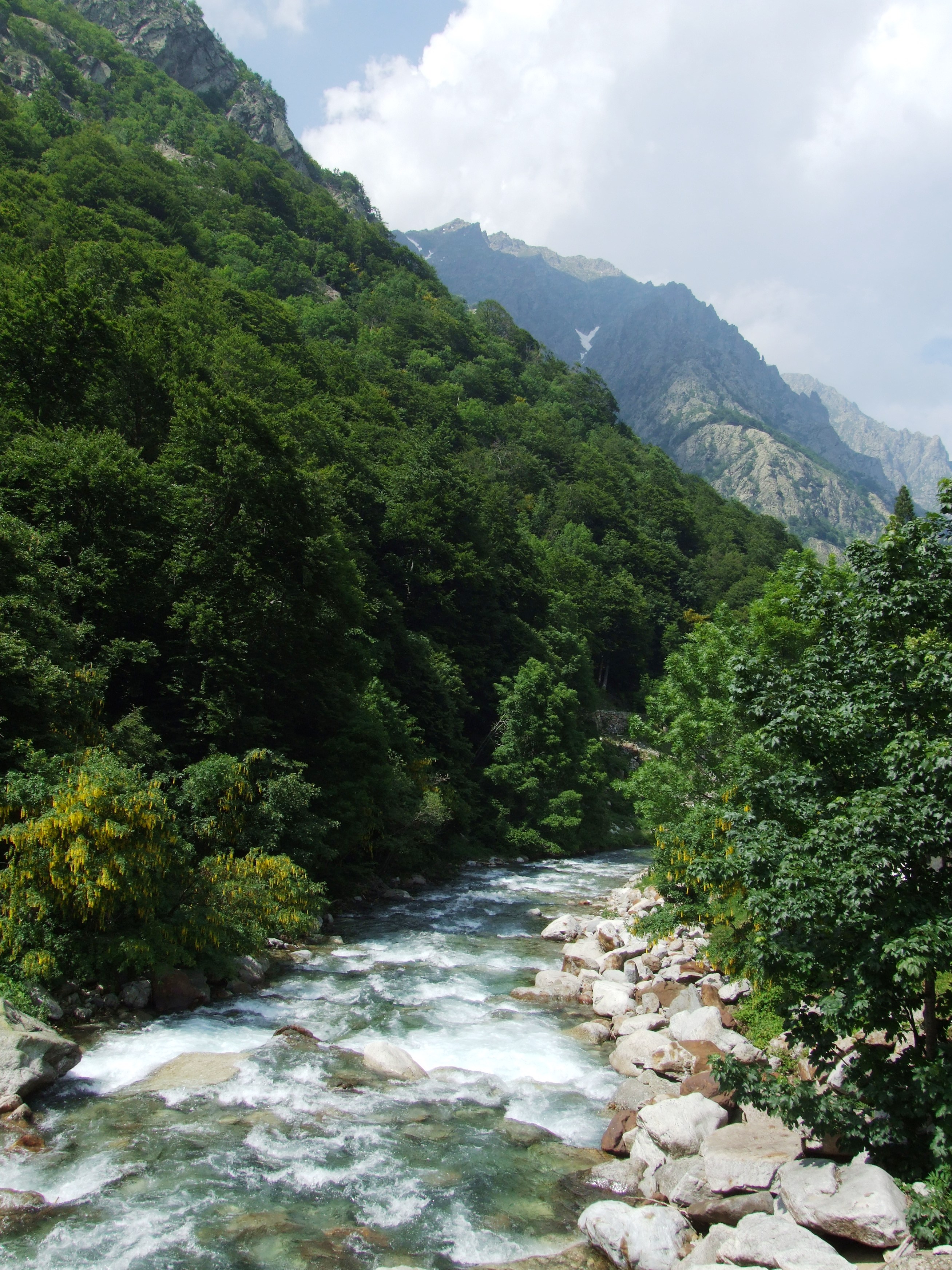 de Valdieri, a spa with a huge hotel and pool next to a roaring mountain stream. A peaceful and beautiful spot. We set out on a hike into the mountains, but had to abort as the path deteriorated, requiring proper hiking boots. We were in sneakers, a sturdy version, but not sturdy enough.