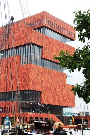 Next on our tour guide’s agenda was the city’s newest sensation, the Mas, a striking and unusual edifice along the river which houses a five-story museum illustrating the story of the city, the port, and their connection to the rest of the world. Bad luck for us – closed on Monday, the day we were in Antwerp. There is a boulevard walkway around the building to the top where the views are said to be “extraordinary.” It too was closed.