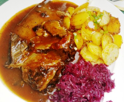 Dining at the three star restaurant was beyond our budget, but we enjoyed the tastes of Germany at the hotel’s gemütlich Dorfstuben where I indulged in my all-time German favorite: Zwiebel Rostbraten (Onion Beef). During our travels we savored other German favorites, such as Sauerbraten, Bratwurst, Sauerkraut and red cabbage.