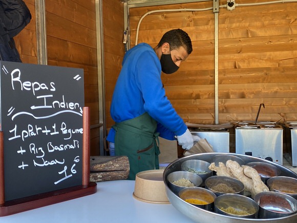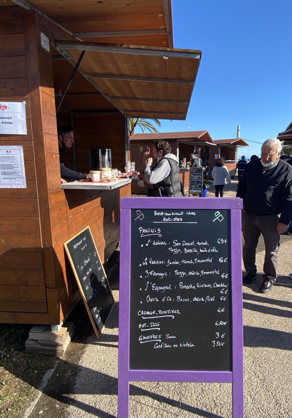 “Restos sur le pouce” (restaurants on the go) is sponsored by the city of Menton which offers restaurants the opportunity to serve take-out food at stands set up along the shore. The stands are Christmas market type chalets. Participating restaurants, fifteen serving a variety of cuisines, pay a small fee to use the chalets. Proceeds benefit restaurants in the nearby Roya Valley which were devastated by Storm Alex, an extratropical cyclone, last October. Extensive flooding destroyed homes and swept away roads, leaving at least 12 dead.