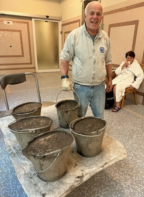 This past Christmas as well as Christmas 2023, I joined friend Angi for a 10-day visit to Abano. Angi is a dedicated fan of the mud. For years she lived in Rome and spent two weeks every year in Ischia, a volcanic island off the coast of Naples known for thermal springs and mud. She had serious back pain following an auto accident which resulted in five fractured vertebrae. The treatments “took away the pain and inflammation,” she says.