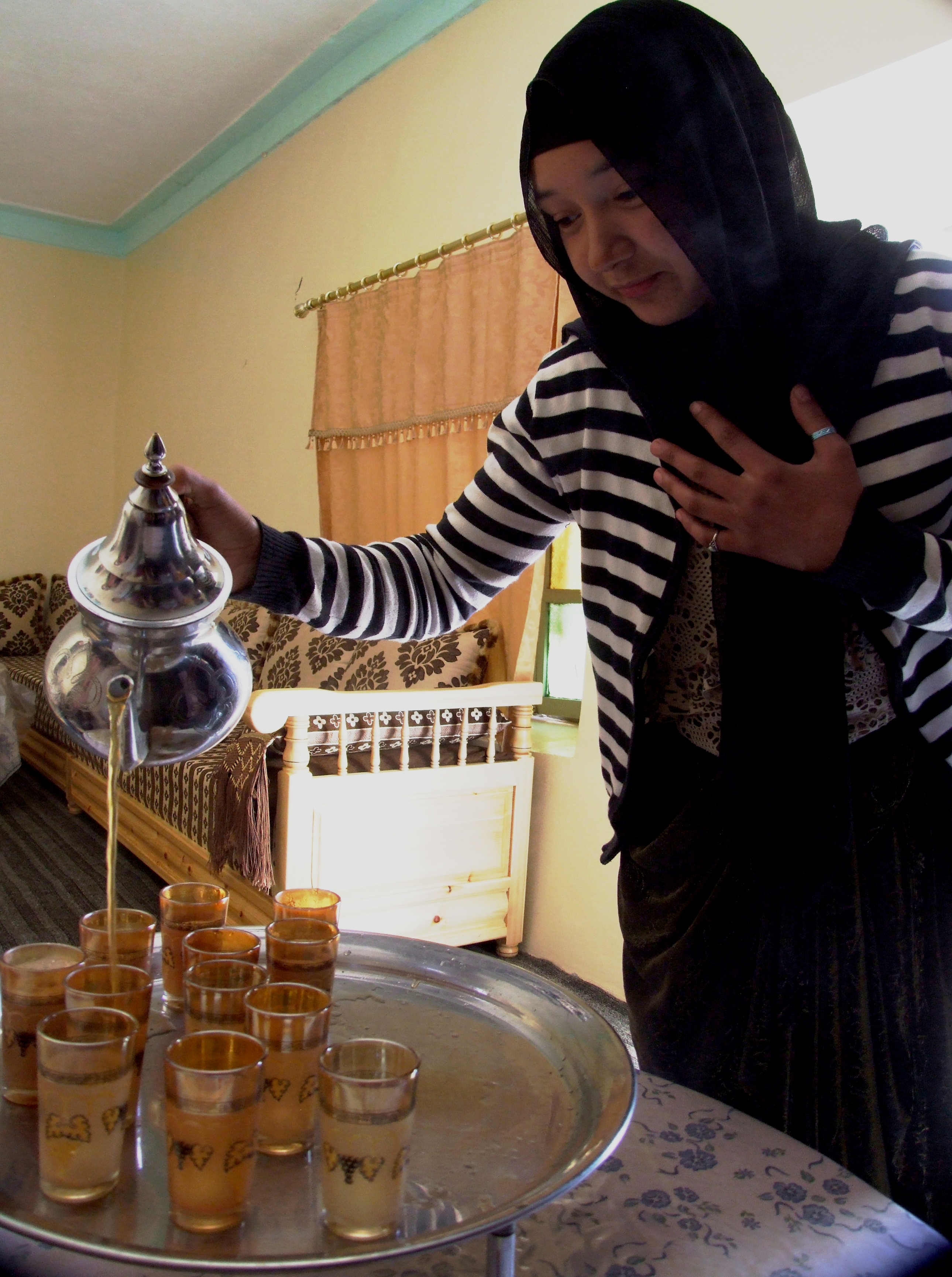 They seemed elated to welcome us. They sprinkled us with rose water – a Moroccan tradition. They served us the traditional mint tea and nuts. They dressed one of our group in a fancy Moroccan headdress. They laughed when we showed them their photos on the camera screens.