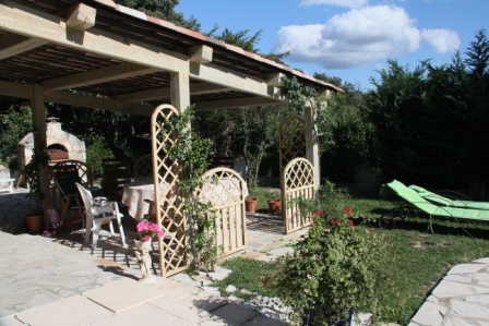 Summertime is also for enjoying our pool and yard and flowers — and the SPPS (State Park Picnic Shelter). See previous post “Pergola — Or State Park Picnic Shelter?” Aug. 22, 2013. It’s looking better, thanks to the decorative elements painstakingly installed by Bob, and Ben’s suggestion that we we lighten the posts and beams. That made a huge difference. Thank you, Ben. You saved it– and our marriage.