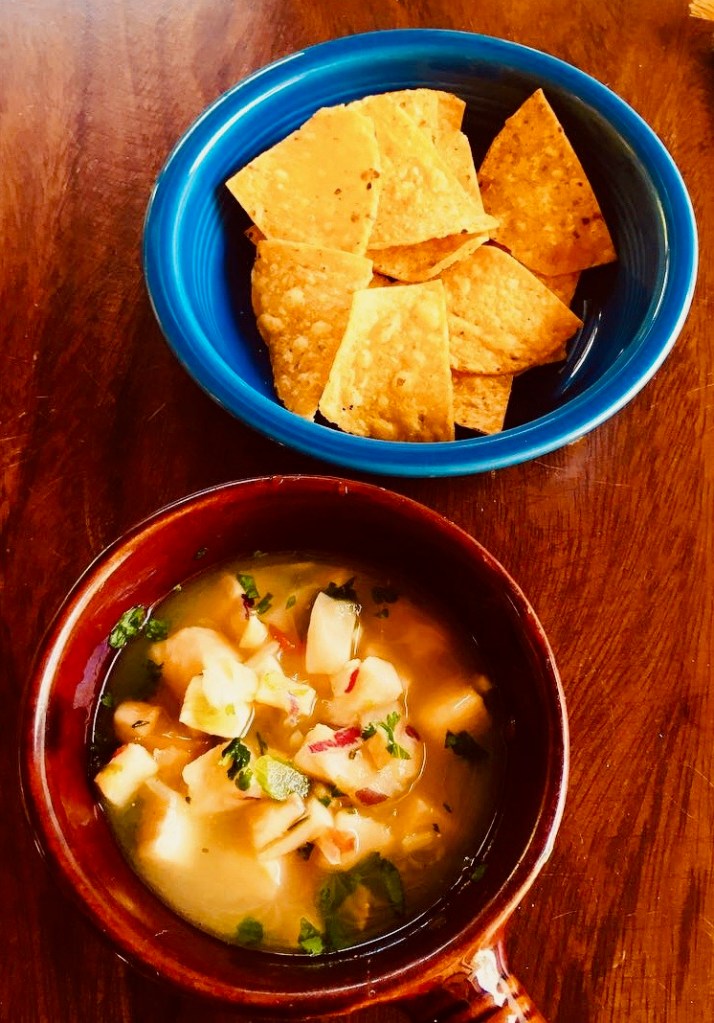 This was my very favorite Costa Rican special. Ceviche, a concoction of raw fish cured in citrus juices, is originally a Peruvian dish, but now found else where. Other ingredients, such was chili peppers, chopped onions, chopped tomatoes and cilantro, can be added at the whim of the chef. As the fish marinates, it “cooks.” I tasted many varieties, including one with shrimp instead of fish. Marinate from 30 minutes to 2 hours depending on how cooked you like your fish. 45 minutes is recommended. Following is step-daughter Kellie’s Costa Rican version. You can experiment, add other ingredients, or omit some. Kellie does not add garlic nor tomatoes. I include both. In Costa Rica, ceviche is usually served with tortilla chips.