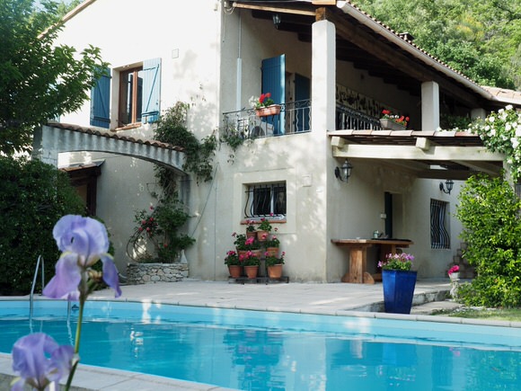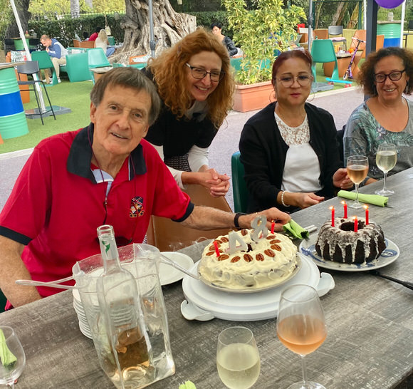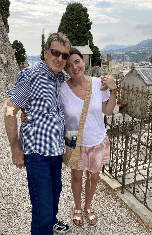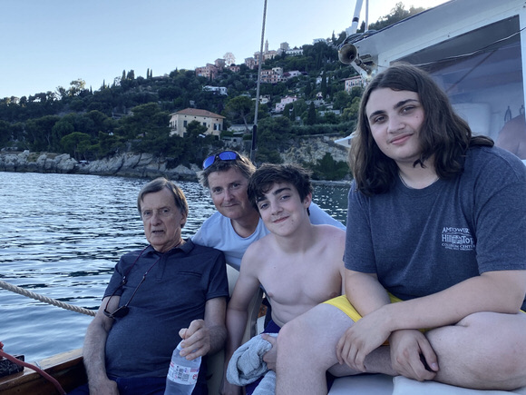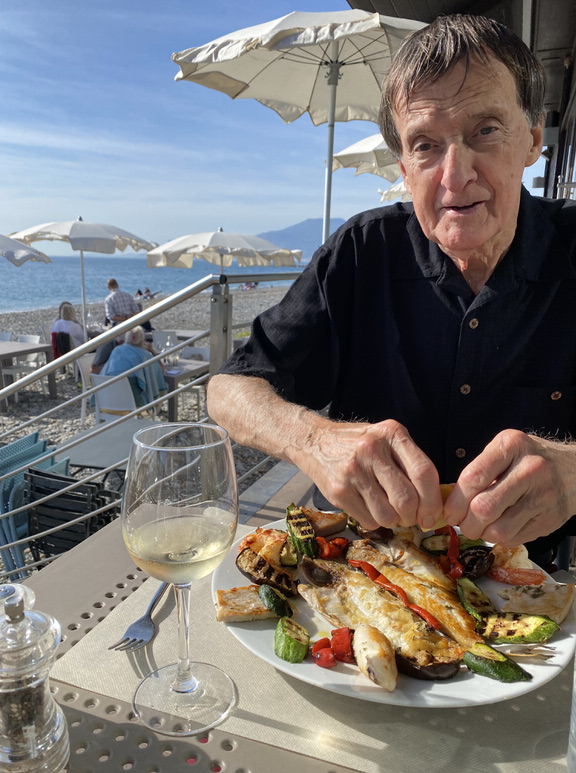 My room: Old, shabby, paint chipped walls, a big hole in the ceiling. Ahh— but the view from the 4th floor balcony is splendid with the Mediterranean Golfe-Juan in one direction, and the Bay of Cannes in the other. “A postcard view,” as a visitor said.
