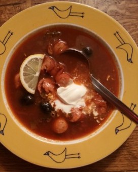 I love making soups — cold in summer and warm in winter. I just tried this one, a recipe featured in the current issue of the magazine German Life, http://www.germanlife.com, from my friend and food writer Sharon Hudgins, http://www.sharonhudgins.com It’s a keeper. Sharon writes that Soljanka is “a hearty stew of Russian and Ukrainian origin, usually made with leftover meats perked up with pickles, olives, capers and lemon” which was popular in East Germany during the socialist era. It’s so good, it stayed on restaurant menus after the Russian troops went home. This recipe makes 10 cups or 6 large servings.