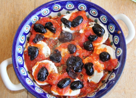 Spoon on one-third more of the sauce. Sprinkle with half of the herbs. Add the other half of cheese, then cover with rest of sauce, sprinkle with remaining herbs and the olives.