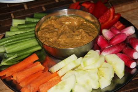 My friend Jane minces no words. “It looks like dysentery,” she said of my dip. “But it’s delicious. What’s in it?” Granted, it would not make a cover shot in a food magazine. But it is tasty and great with veggies or chips. According to the recipe preface, it’s “similar to the peanut sauce that accompanies an Indonesian satay.” This recipes makes about 1 1/2 cups of dip.