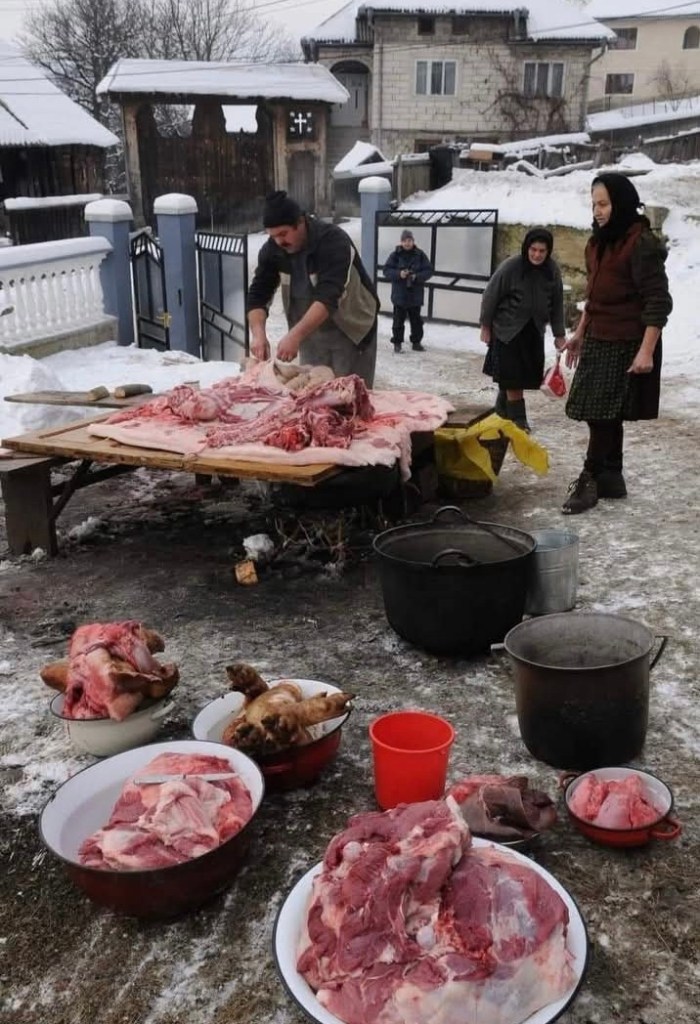 ROMANIA: Romanian Florin remembers childhood Christmases in his country where carnati (smoked sausage) is a holiday must. Preparation in country villages begins on December 18 when neighbors gather outdoors to kill a pig, then cover it with hay and set it afire. Gruseome! Florin even remembers killing the pig once. The cooked beast is divided into parts. All work together to turn out the tasty sausage.