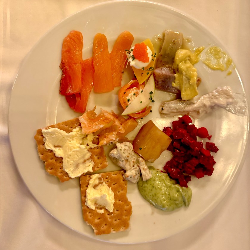 The canonical way of eating your way through a Julbord is to start with a plate of cured salmon, several varieties of smoked salmon, and at least three — preferably 5-7 — different kinds of pickled herring , mackerel, smoked eel and various sauces eaten together with boiled potatoes and “special Christmas edition” crisp bread.