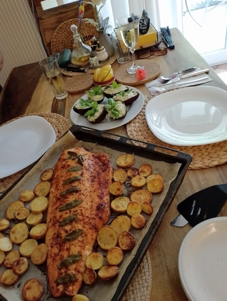 Thiemo serves the salmonAndrea’s roasted no salmon and potatoesAndrea and her mother Tekla