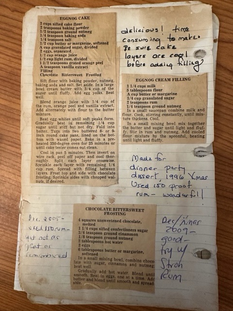 I’m old and so is this treasured Christmas recipe. Long ago I clipped recipes from newspapers and magazines. This one is a winner. Read my scribbled notes. I always go for recipes with a bit of booze. Rum makes this cake.