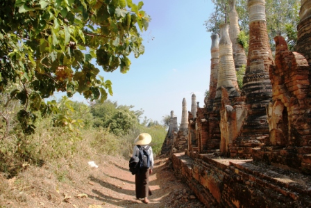 We visited the Inn Thein Pagoda complex where some 1,054 small stupas are overgrown with moss and greens. Most date from the 16th to 18th centuries and have decayed with age and encroaching vegetation. Theft has been another problem. Gold and other precious valuables are often sealed inside Buddha statues. Thieves destroy the Buddhas to recover the goods