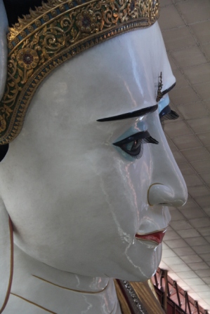 The Reclining Buddha, 235 feet long, was originally built in 1907, but destroyed by the British and Japanese during World War II. It took five years (1952-1957) to make a new Buddha. “It took two years just to make the glass eye,” Min said. I was perplexed by Buddha’s face – eye make up, lipstick? Isn’t Buddha a man? “We want Buddha to look pretty like a woman,” Min explained.