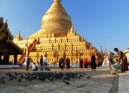 But, it should be seen. The temples are in various states of decay and reconstruction. Many can be entered, Buddha statues admired, chambers explored. Some even have traces of ancient wall paintings. Sai took us to Schwezigon Pagoda, considered the most important of Bagan’s temples, in the early morning when the sun’s rays were still soft, workers were busy sweeping the grounds and monks arrived to worship. Few tourists to tarnish the mystical ambience.